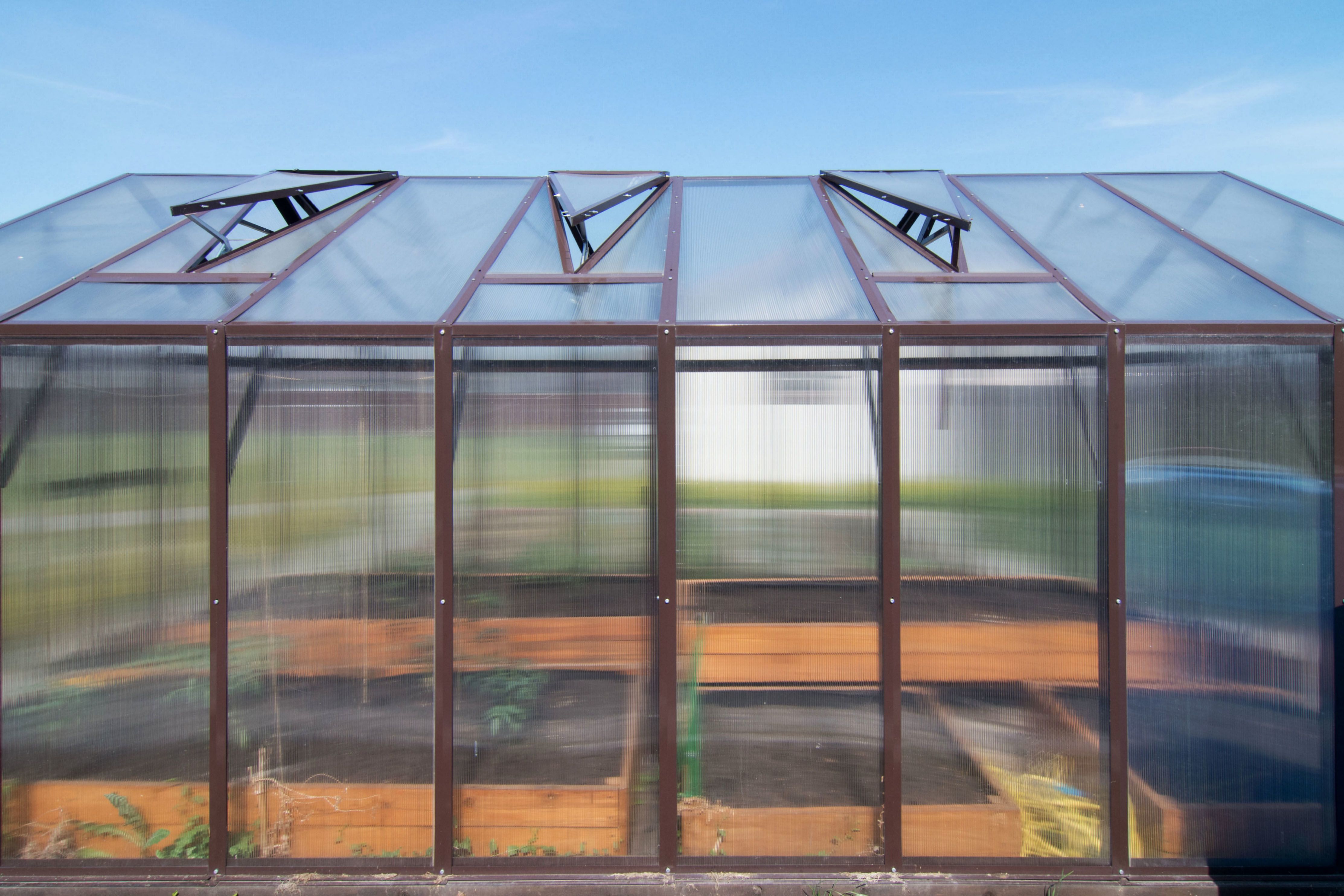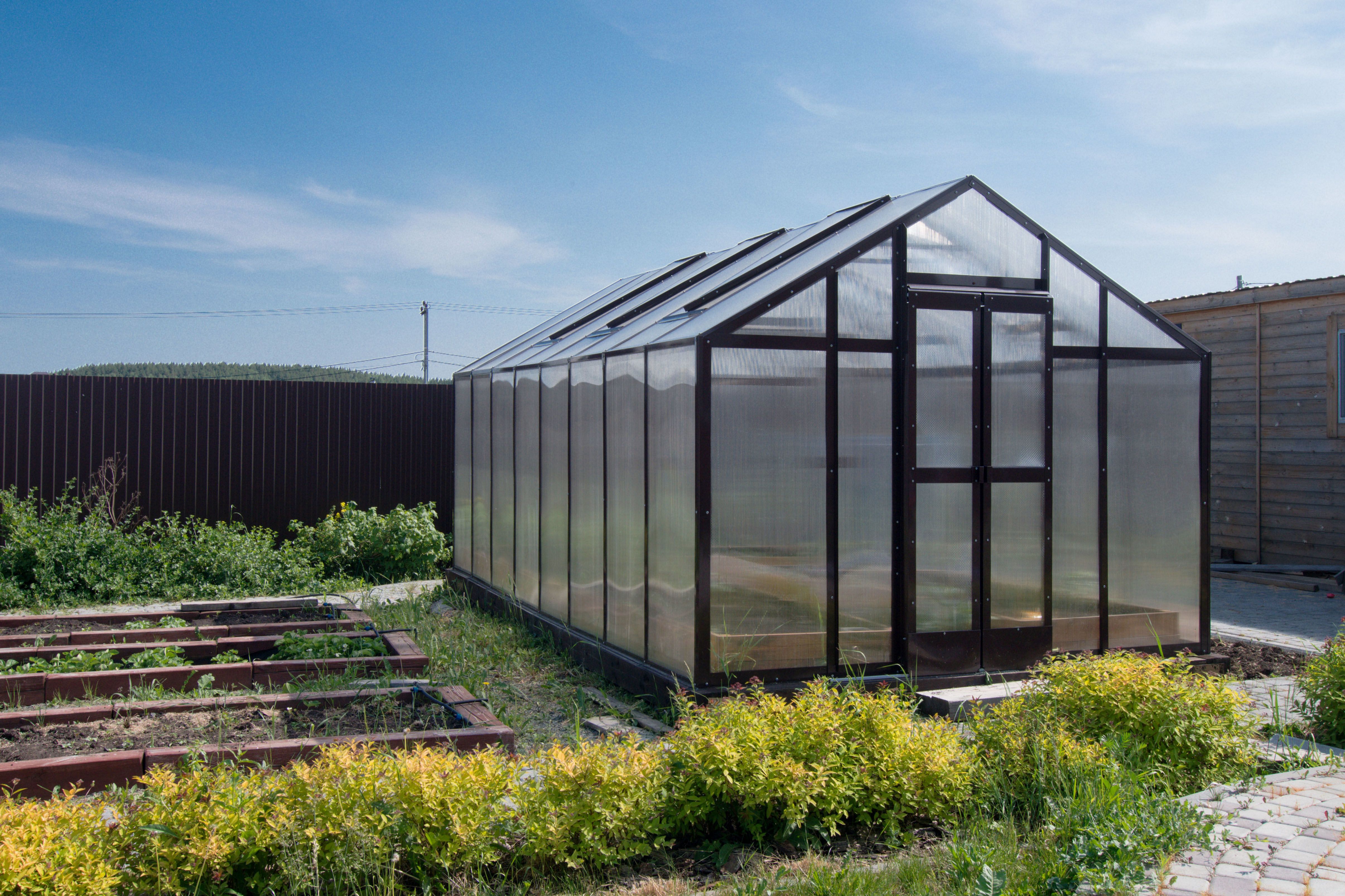 Для теплицы используется сотовый поликарбонат — современный светопрозрачный материал с внутренними воздушными ячейками. Он удерживает тепло, снижает перепады температур внутри теплицы и помогает создать стабильный микроклимат для растений.
